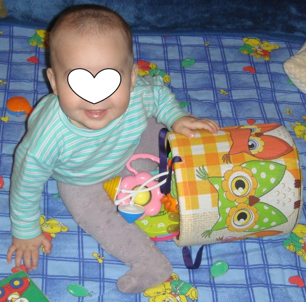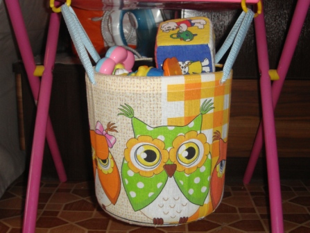 Короб для мелочных игрушек-погремушек. Можно поставить где угодно или подвесить. В качестве каркаса - обрезанная пластмассовая банка из-под спортивного питания