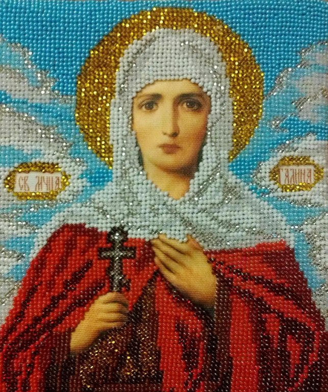 Техника вышивания: полукрест с постоянным соблюдением направления диагонали, ювелирный бисер. В церковном календаре Св. мученица Галина Коринфская поминается дважды: 23 марта и 29 апреля по новому стилю. Ученица праведного старца Кондрата, Св. Галина приняла мученическую кончину за веру Христову вместе с другими его учениками в первый день Пасхи в 258 году. Имя Галина в переводе с греческого означает «тишина», «кротость» и символизирует гармонию, спокойствие, упорядоченность во всех делах.