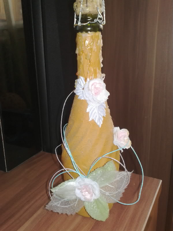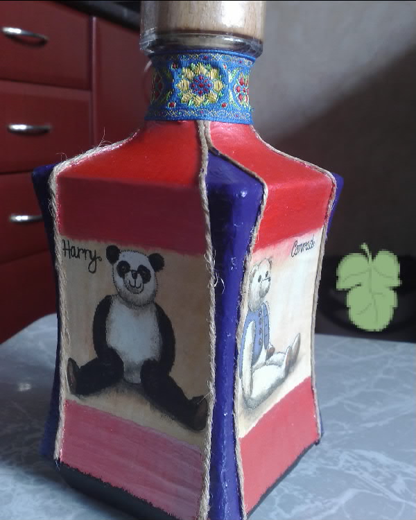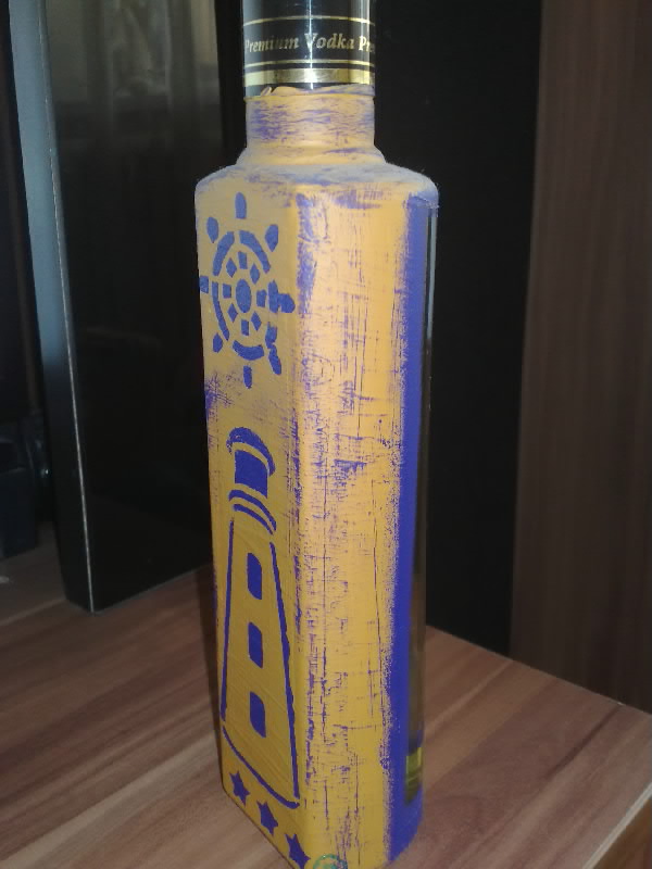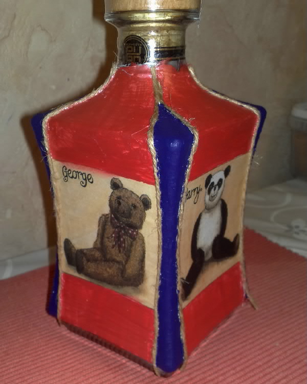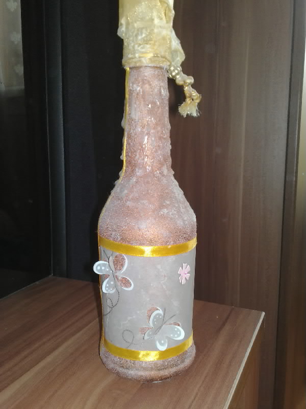 мне не подходит аэрозоль, будь то краска или грун. Я дочку грудью кормлю а даже через распиратор я чувствую эту каку и в подъезде соседи ворчат а дома муж так что я как нибудь так.конечный вариант мало отличается от предыдущего, я покрыла 2 слоями лака, на горлышке появился декор в виде толстой ленты, и немного затушевала края перехода краски, честно сказать мне эта работа не очень нравится (хотя муж в восторге) под конец чел.которому ее делала передумал ее забирать и я доделывала "спустя рукава" лень что ли а с грунтом я обошлась так как советовали выше, покрыла толстым слоем диспер.краски (2 раза) и начиная с грубой наждачки перешла на 0-ку