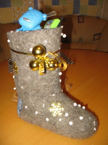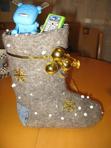И ещё наша прошлогодняя поделка к Новому году. На валенок пришили заплатку, декоративные снежинки; снег - приклеенные шарики из пенопласта; внутри - разнообразные детские игрушки.