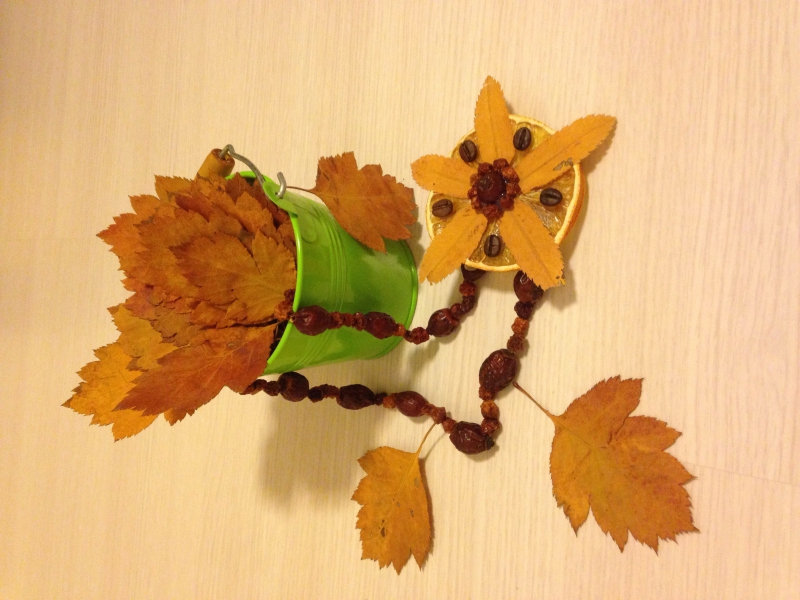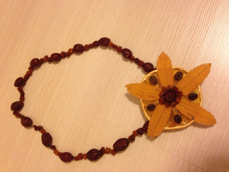 По заказу воспитателей сделали вот такие бусы из шиповника и рябины , долька апельсина , кофейные зерна и листики рябины