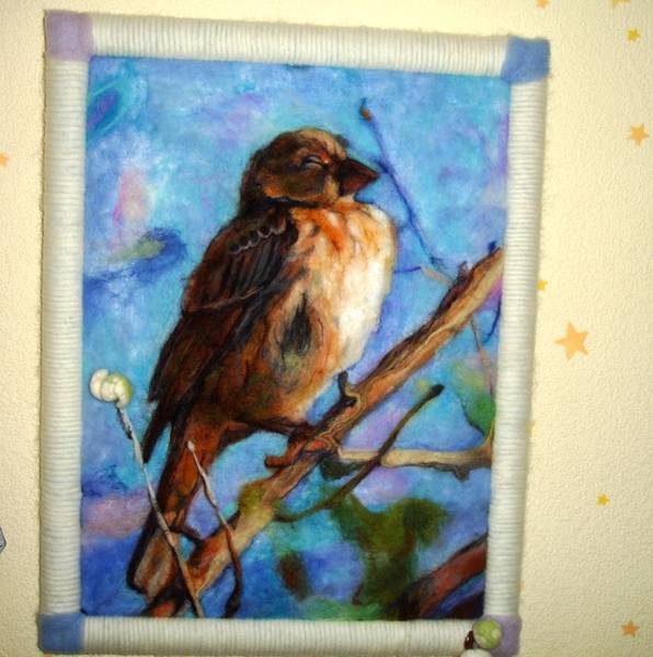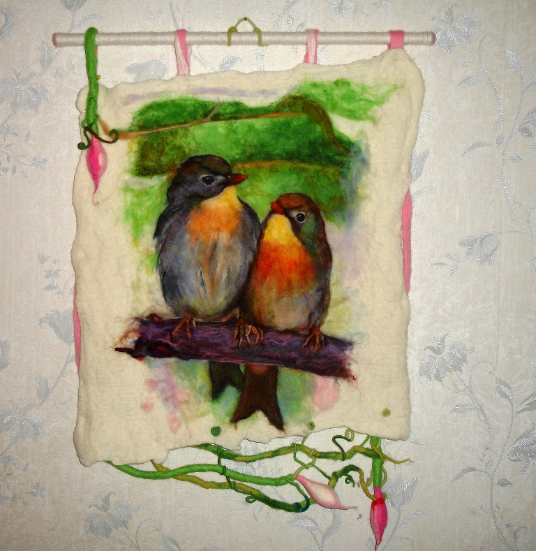 Ola-la мне кажется сначала надо было косметичку свалять, а уже потом рисунок, сначала иголочкой набить и потом маленько затереть. Ну это мое мнение конечно. Вообще я люблю картины по-сухому выкладывать красота не теряется и можно все поправить, а вот по-мокрому конечный результат неизвестен или надо сто вот таких кометичек навалять , чтоб руку набить.