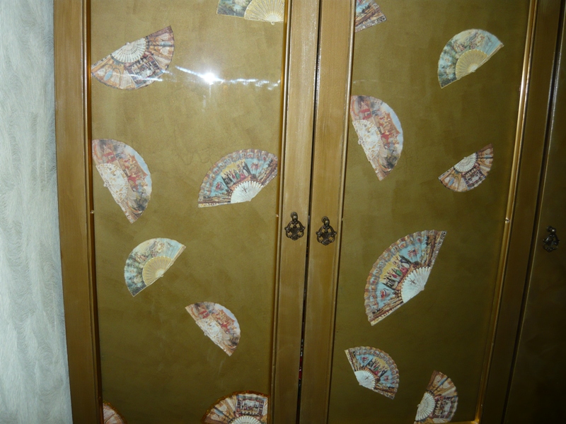 Обновила старую полированную стенку. Переехали в новую квартиру, денег на мебель после ремонта не осталось. Стенку ошкурила крупной наждачкой, покрасила золотистой серебрянкой (покупала в строительном магазине, литровая банка около 100 рублей стоит). Красила пароллоном, круговыми движениями, в три этапа, наносила один слой, после высыхания следующий. Сняли стекла с дверок, на них сделала обратный декупаж (для картинок покупала бумагу в Кладовке)