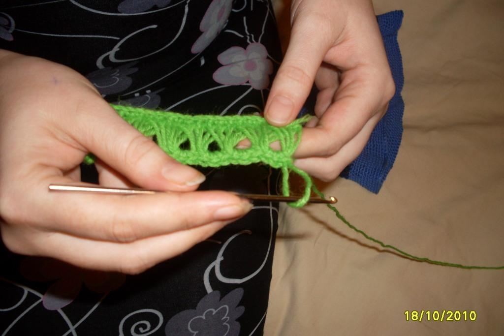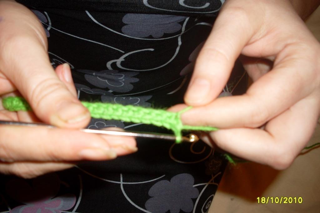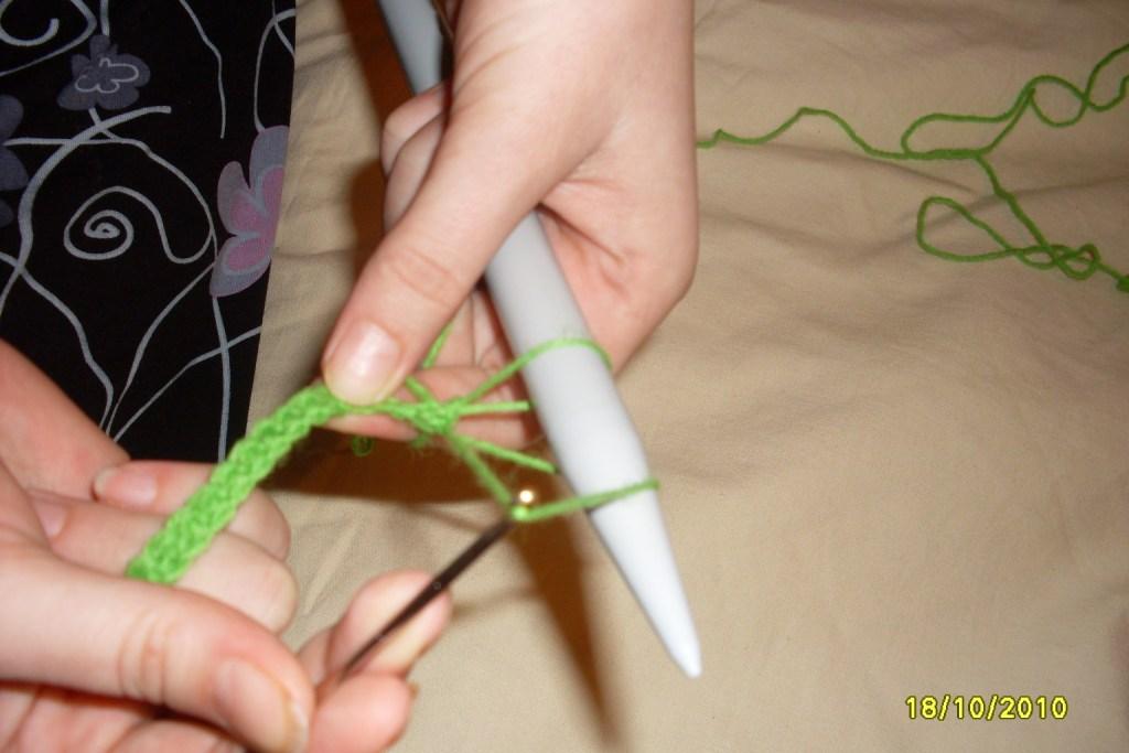 крючек вводим в нижележащий столбик, как при обычном вязании, вытягиваем длинную петлю и одеваем её на спицу