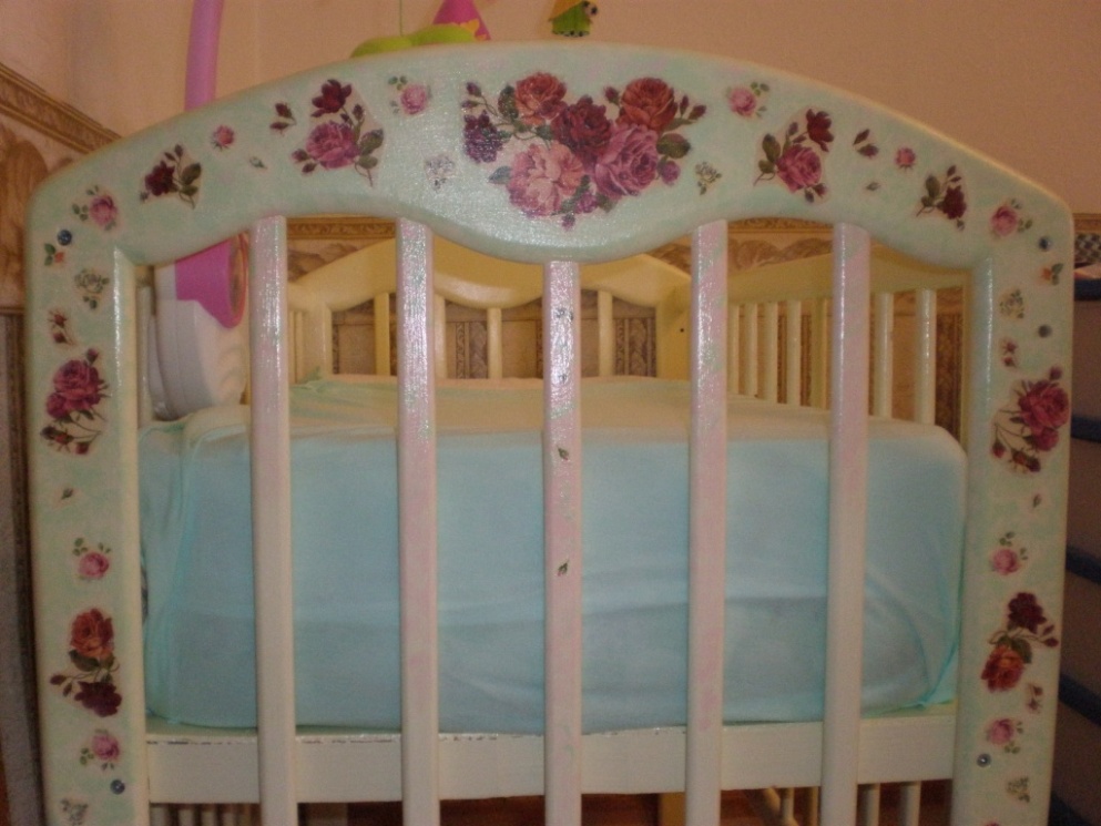 Подносы и доска просто шедевр!!! А я оформила детскую кроватку в технике декупаж и стул. Делала впервые. Кракелюр хотела использовать, но потом передумала и просто сделала примочки губкой зеленым и розовым. Вложение: Вложение: Вложение: Вложение: |