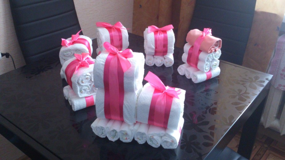 Мамочки Я занималась и декупажем бутылок но как то приелось уже и что то новенькое хочется интересненькое, вот чем занимаюсь. Отправляясь на смотрины или крестины, мы обычно пачками закупаем подгузники, пеленки, бутылочки, соски, погремушки, игрушки и прочие полезности и забавные безделушки. Безусловно, можно особо не морочить себе голову, а просто заявиться на праздник как Дедушка Мороз с полным мешком подарков. Но почему бы не подойти к вопросу креативно и не преподнести подарки в оригинальной форме? Например, в виде симпатичного тортика из подгузников, я так и сделала и наши знакомые и друзья были в восторге от такой идеи. Для изготовления этого шедевра понадобятся только чистые подгузники
