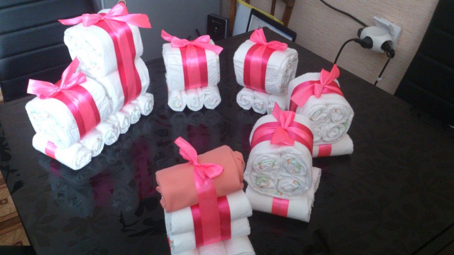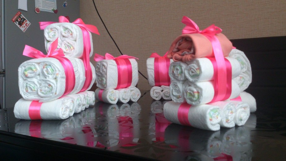Да и «выпекать» тортик тоже не придется, а вот запастись терпением и включить фантазию будет совсем не лишним. По-моему, подарок просто замечательный, ведь, помимо памперсов, из которых и создается торт, в ход идут игрушки и прочие детские принадлежности, которые используют для украшения торта. Внутри тортика, специально для родителей, можно припрятать даже бутылочку шампанского Ингридиенты для тортика: 1. Памперсы, количество которых напрямую зависит от размеров будущего тортика и технологии его создания. Для нашего трехслойного тортика понадобится 70 подгузников. Можно ограничиться одним размером или использовать сразу несколько. Я в основном использую "1". 2. Красивый поднос, подставка или плотная картонка, на которой будет стоять торт, вырезаем круг и обклеиваем красивыми салфетками. 3. Резинки для денег, обычная бельевая резинка или веревочки. 4. Широкие цветные атласные ленты для украшения торта. 5. Игрушки, погремушки, носочки, пинетки, прорезыватель, пустышки и прочая детская мелочевка для оригинального оформления торта. 6. Прозрачная пленка для заворачивания подарков. 7. Также пригодятся английские булавки. И так сварачиваем памперс рулончиком и фиксируем резинкой и так все 70 шт. Когда все рулоны готовы ставим в середину (например термос небольшой) и по кругу располагаем остальные добиваемся нужного объема и затягиваем атласной лентой, аккуратно вытаскиваем термос и в середину добавляем еще рулончики до плотного состояния, и так делаем три яруса. Выкладываем на заранее подготовленную основу сначала самый большой-широкий ярус , затем поменьше и на верх самый маленький и начинаем украшать. Ниже выкладываю фото, чтоб наглядно было понятно что же получается.