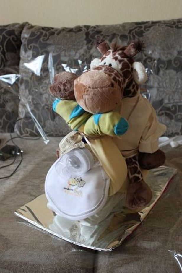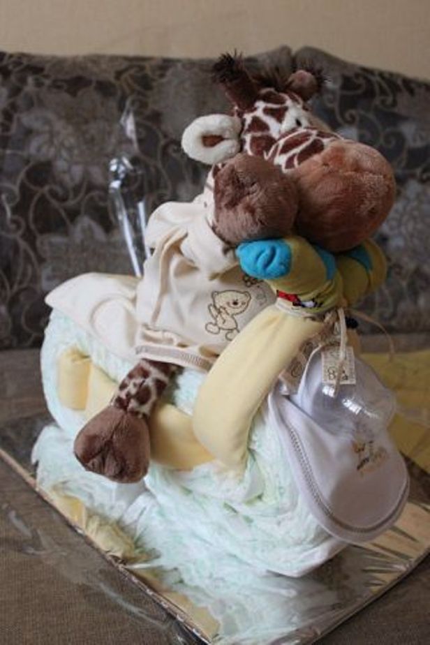 Да и «выпекать» тортик тоже не придется, а вот запастись терпением и включить фантазию будет совсем не лишним. По-моему, подарок просто замечательный, ведь, помимо памперсов, из которых и создается торт, в ход идут игрушки и прочие детские принадлежности, которые используют для украшения торта. Внутри тортика, специально для родителей, можно припрятать даже бутылочку шампанского
