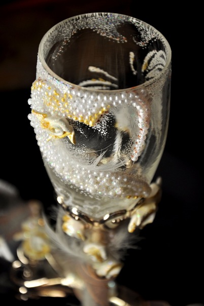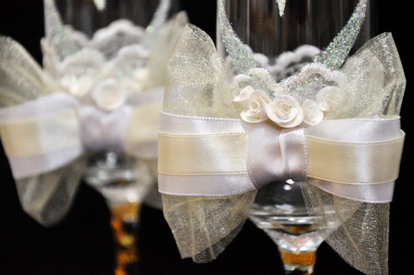 А мне нравится оформлять бокалы. Украшения наклеивались на бокалы термопистолетом и моментом (кристалл). Вот только кружева пришивались ниткой с иголкой, а блёстки клеились на обычный лак для ногтей. Вот что из этого получилось:
