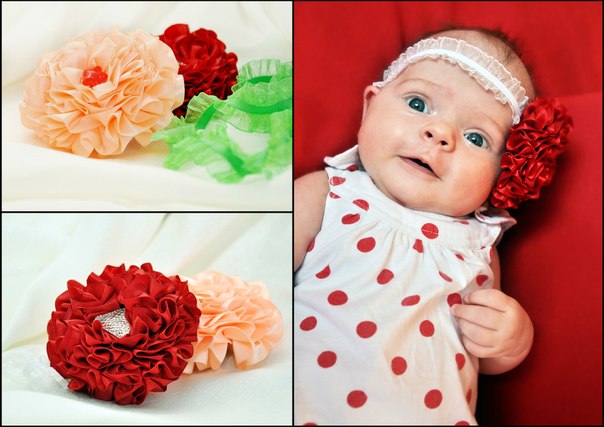 Использовала обычные атласные ленты. Собирала гармошкой (иголкой с ниткой), а после нашивала на круглую основу (кусочек плотной ткани).