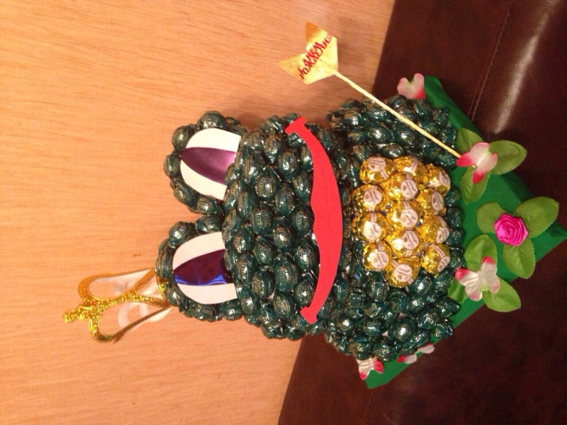 Всем доброго времени! Насмотрелась вашей красоты. Все такие умнички, работы просто супер! Я тоже увлекаюсь творчеством. С 5 лет вяжу спицами, чуть позже крючком, последнее время увлекалась скрабом и немного моделированием из конфет. Вот такие подарки у меня получились из конфет. Основа пенопласт или бумага и волшебный скотч.