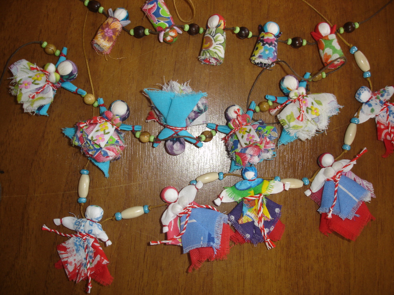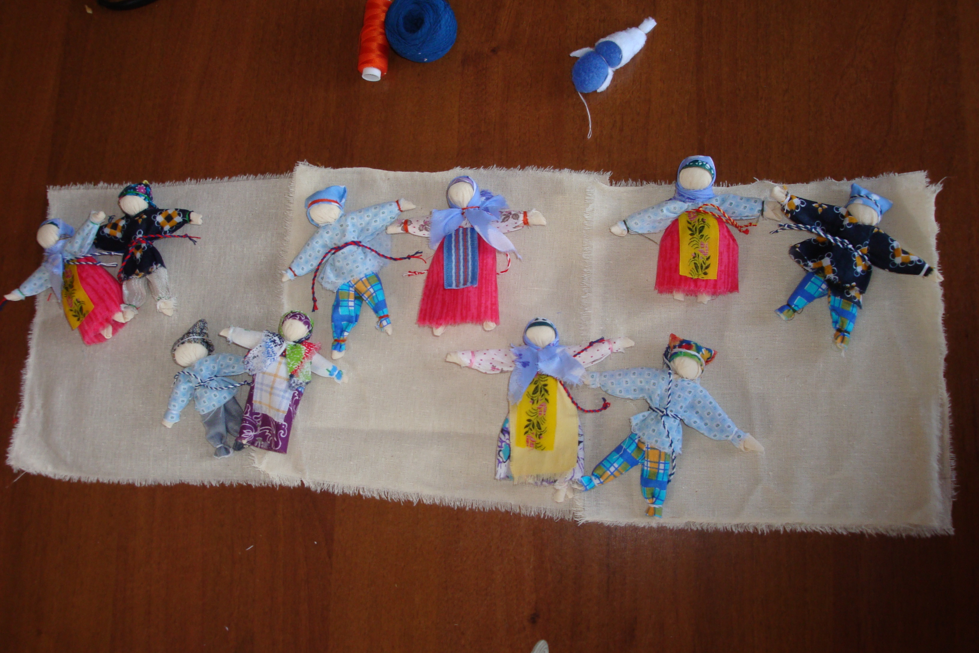 Насколько я поняла следующий мастер-класс будет после 10 июля, но вот кукол из пластика я там не видела. Мы делали из ткани и ниток, без иголок, там в основном все такие, ещё из лыка были. Вот что у нас получилось.