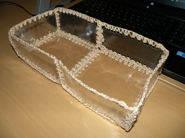 Когда-то сотворила такую штуковину из пяти двухлитровых пластиковых бутылок, дырокола, ниток. Используется для хранения обувных щеток.