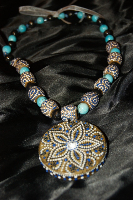 и сегодня закончила бусы. Подарок ко дню рождения для жены брата мужа. Деревянные бусины расписаны контурами синим и белым, плюс керамические и стеклянные бусины, кулон роспись синими, белыми и черными контурами, стразинка посередине. Все деревянное покрыто лаком. Надеюсь понравиться))