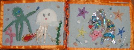 Большая красная рыбка опять же на пуговице. Под щупальцами осьминога и медузы прячутся маленькие рыбки. Большая золотая рыбка сделана из пайеток, имитирующих чешую. Маленькие звездочки двигаются по ниточкам.