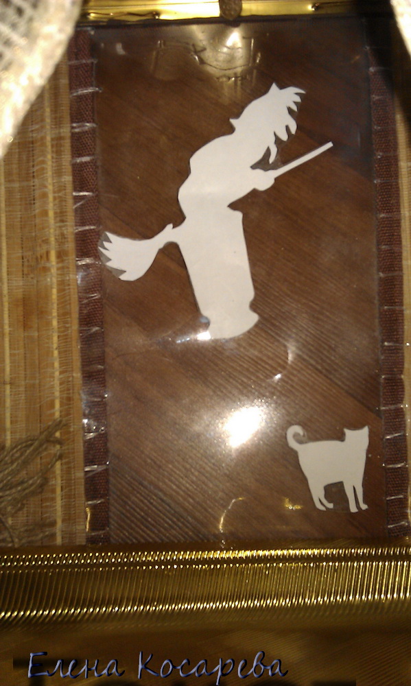 7.Никак не обойтись без окна (точнее, целого витража): есть надежда, что и в него будет заглядывать наше редкое северное солнышко. Силуэт Яги и котик - скачаны из сети, за что, пользуясь случаем, низкий поклон, тем, кто их разместил в открытом доступе. Окно - есть центральная часть пластиковой бутылки (2л.). Пришито прозрачной леской. Без вспшки, при обычном освещении леска почти не заметна.