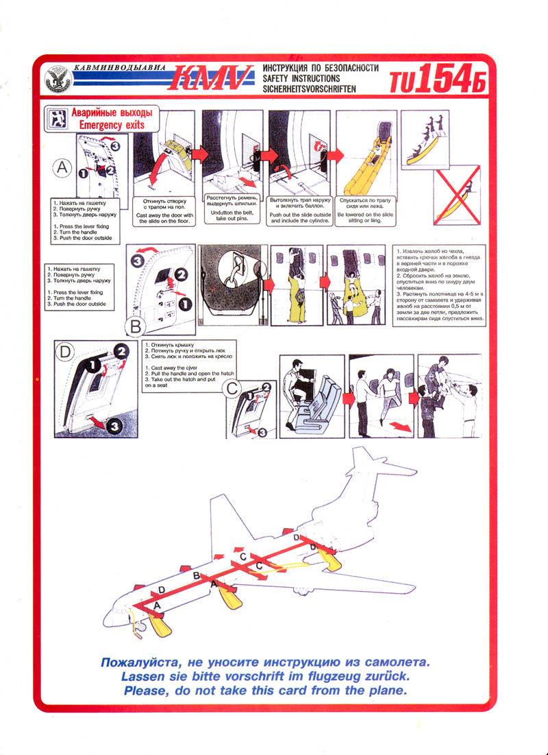 Dream писал(а): Такая карточка находится в кармашке впередистоящего кресла по 2 на ждом ряду, Это то, что никто и никогда не читает! Я первым делом после расположения в кресле изучаю эту карточку и выглядываю аварийные люки, а также просчитываю возможные пути эвакуации ![]() ![]() ![]() ![]() Dream писал(а): Паника самый главный враг спасения! Увы, согласна. Причем относится это к любым видам ЧС.