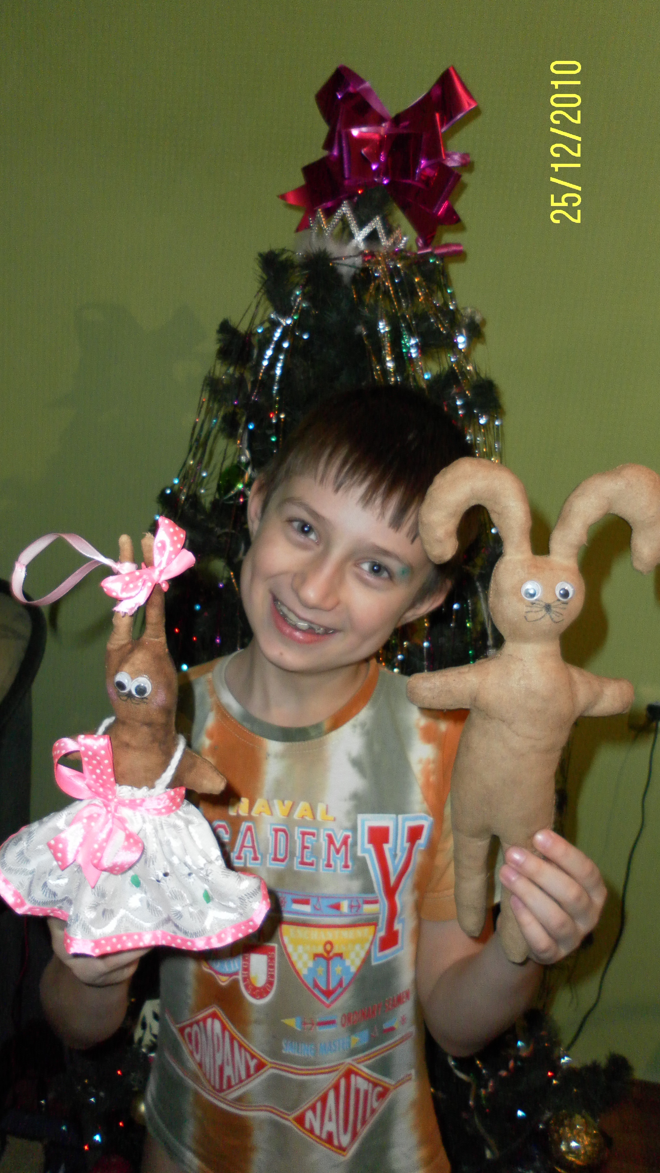Моему сыну Матвею 8 лет.Он очень любит творить поделки своими руками.Круг его интересов обширный, быстро увлекается чем-то для него новеньким.Я ему помогаю.Вот последние его поделки.Шили вместе.Зайцы пряничные,вкусненько пахнут.