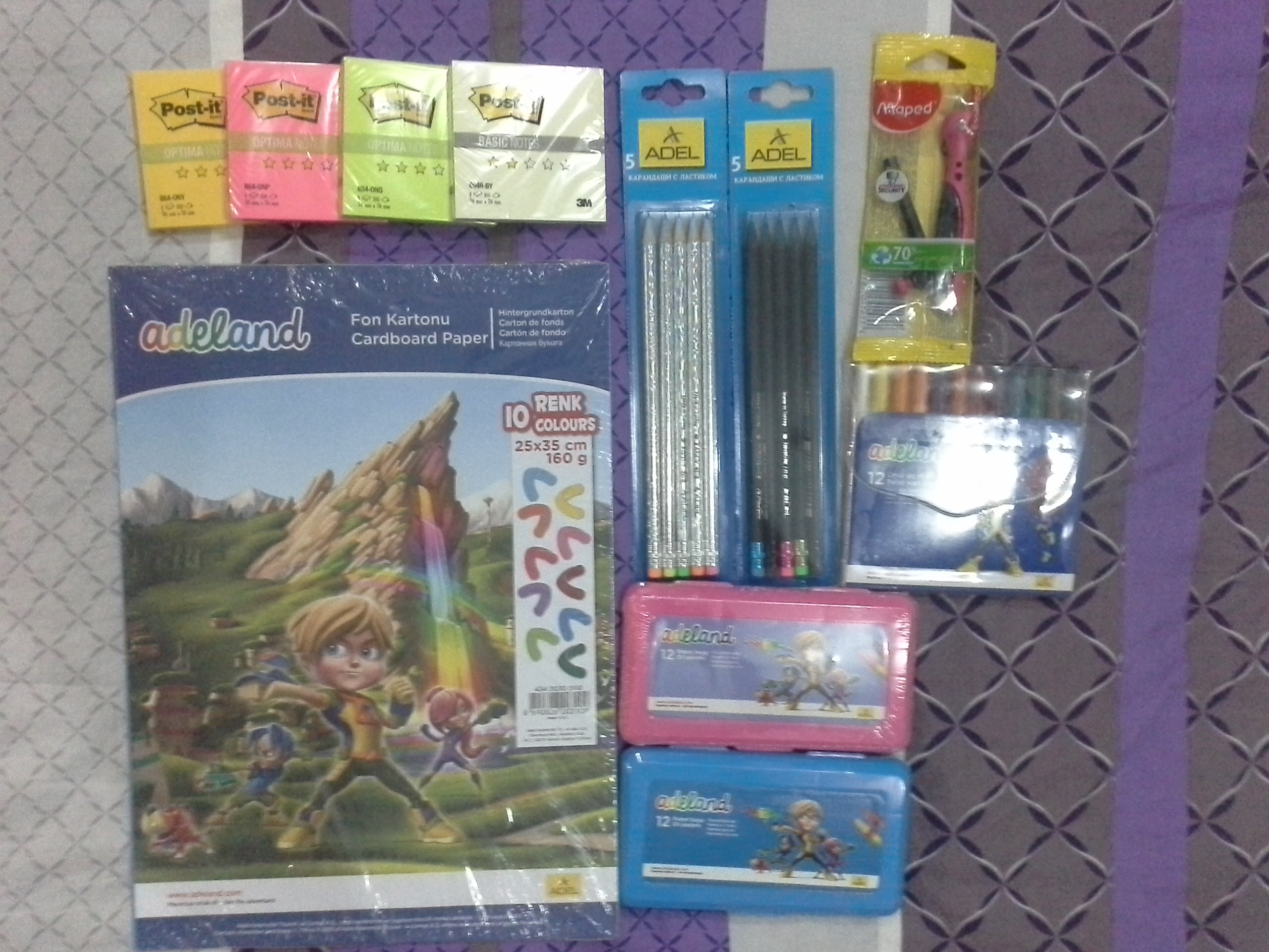 В Детском мире скидки на концтовары. В наличии остались - цветной картон, мелки восковые двух видов, карандаши 5 шт. - 50 руб., стикеры - 10 руб.