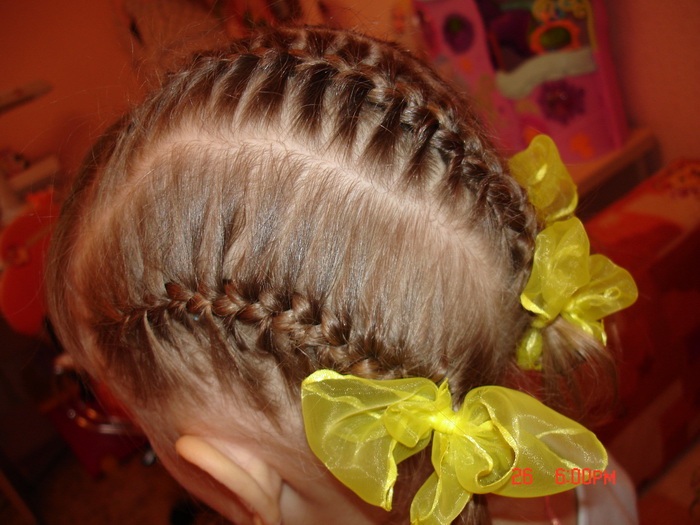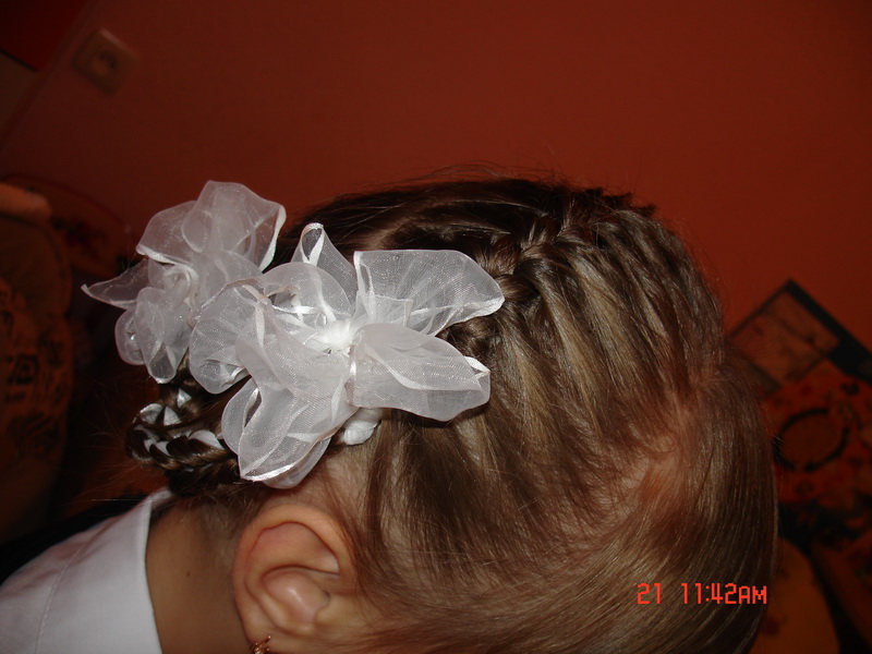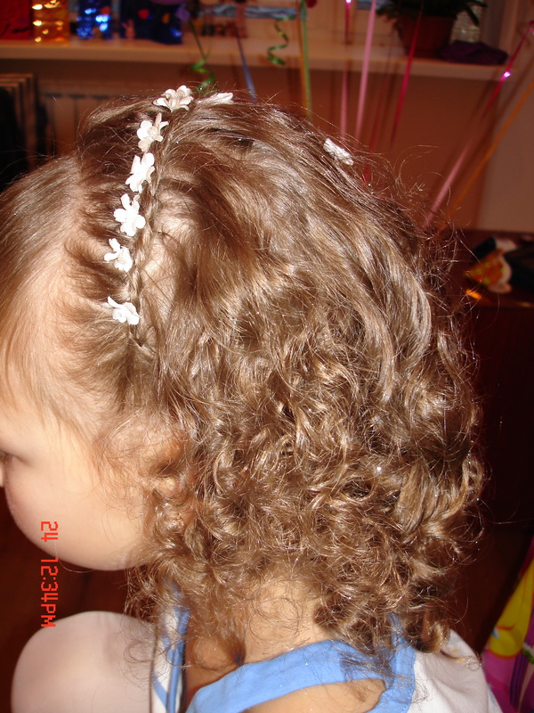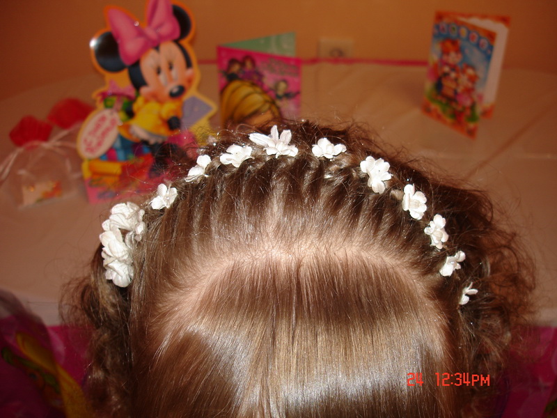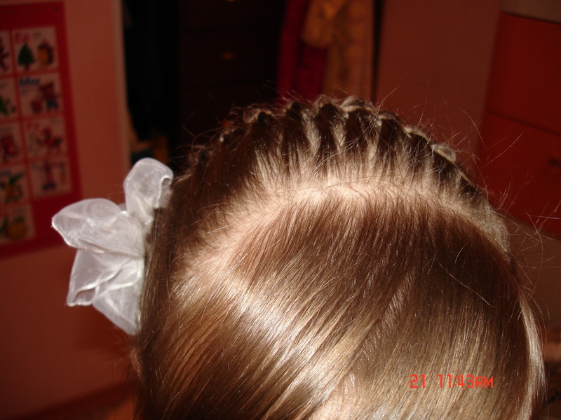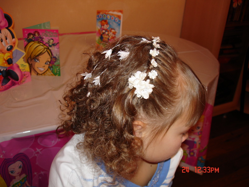 А эти цветочки- заколки или резинки вплетаешь? Попробуй точно также, но по спирали. Очень красиво получается.вообще я считаю, что у девочки на голове должен быть порядок. Или короткая стрижка.