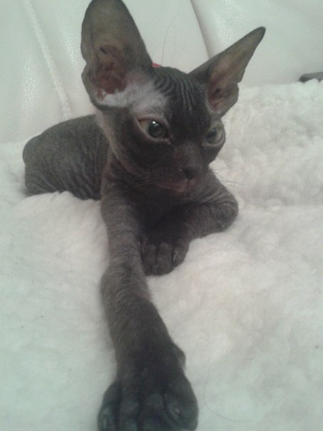 девочки,хочу рассказать про кошечек породы донской сфинкс.мы сначала не хотели брать таку страшилку домой.но потом пришли в гости к "маме" нашей кошечки и увидели малюсеньких сфинксят,боже какие они ласковые оказывается!такая сверхласковость-отличительная особенность кошек породы-сфинкс.Взяли мы себе кошечку домой(она у нас велюровая),то есть не полностью лысая ,а на ощупь как мягкий бархат-и счастью нашему до сих пор нет предела.ее любит вся семья-она супер супер ласковая.в общем теперь мы поклонники кошечек сфинксов.вот наши фото