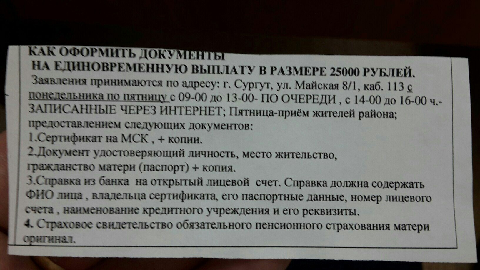 SvetlanaNik писал(а): Девочки, подскажите, какие документы необходимо предоставить в мфц для выплаты 25т.р. из мат.кап? Заранее спасибо!