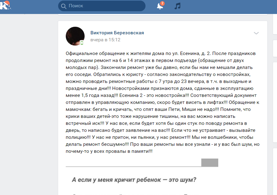 Закон который Вы сбросили,я читала.Только он не в почете у зачинщиков конфликта.Эта девушка мотивирует какой-то выдержкой из закона,в которой говорится про новостройки младше 1,5 .Якобы вот в таких новостройках нормы времени тишины совсем другие. Дает ссылку на вот этот материал https://zakondoma.ru/sosedi/mozhno-li-d ... zakon.html Я почитала,во первых не нашла инфы о разрешении шуметь в новостройках(может мимо глаз )Во вторых там говорится про Москву.У каждого субьекта свои местные дополнения(не знаю как юридически правильно выразиться)Мы же живем в ХМАО....Ну в общем ,что с этими молодыми семейными парами делать ума не приложу.Они якобы были у какого юриста,и он им обьяснил,что в новостройках можно проводить работы в праздничные дни.Вот суть конфликта.Я понимаю,что какая-то простите фигня,но не могу ни где по нашему ХМАО хотя бы выдержку из закона найти ,где прямым текстом будет разрешение делать ремонт в праздничные дни в новостройках младше 1.5 лет.В группе такой конфликт разгорелся не шуточный,ну и в подъезде соответственно.Сейчас выходные новогодние каникулы.Люди целый день дома.Одни на радостях колотят со всей дури,другие с ума сходят от шума,даже работающий телевизор заглушает.Ну и какие это выходные новогодние?Ну не Комаровой же писать,это уже смешно. P/S-участковый видимо тоже отдыхает,телефон не берет((((
