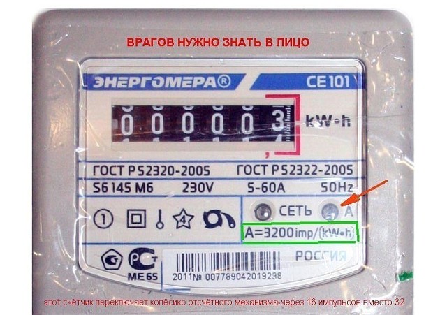 из одноклов: Случайно обнаружили, что домашний электросчётчик завышает свои показания ровно в два раза из-за неверного подсчёта электронных импульсов. ВСЕ проверенные нами счётчики оказались работающими «в режиме двойной тариф»; Итак, как же проверить свой счётчик. На фото — пример рядового электросчётчика. Зелёной рамкой обведены цифры «A=3200imp/(kw*h)». Они значат, что в данном конкретном счётчике один киловатт*час «набегает» ровно через каждые 3200 импульсов, отображаемых светодиодом «А», который отмечен на фото красной стрелкой (прошу заметить, что число «А» в разных счётчиках бывает очень разное). Именно эти электронные импульсы и подсчитываются механическими колёсами счётчика. Другими словами, каждый три тысячи двухсотый импульс знаменует собой один подсчитанный киловатт*час. Подобный счётчик, но с обманной предустановкой, насчитывает киловатт*час не за 3200, а за 1600 импульсов — ровно в два раза быстрее. Чтобы проверить свой счётчик, не обязательно сидеть перед ним и считать 3200 импульсов (или сколько там у вас будет). Самый правый «сегмент» счётчика показывает не киловатты, а его сотые доли (0,01 kW, на фото обведён красной полурамкой) и этот «сегмент» разделён на 100 частей. Через каждый подсчитанный 1/100kW слышится характерный щелчок и колёсико сотых долей киловатта прокручивается на одно, самое маленькое, деление. То есть, в нашем случае счётчик должен щёлкать каждые 3200/100=32 импульса (моргания светодиода), а лично ваш — А/100 импульса. «Неправильный» счётчик будет щёлкать в два раза чаще, в нашем примере — каждые 16 импульсов. Другими словами, вы должны проверить соответствие заявленного заводом-изготовителем количества импульсов на каждый киловатт*час с реальным количеством этих импульсов, подсчитав, действительно ли за А/100 импульсов «набегает» 0,01kW.