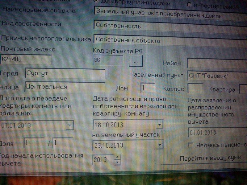 | - голос + Слушайте, ну все заполнила и записалась га сдачу уже а здесь не могу понять какие ставить даты. Дело в том что мы ипотеку брали и оформили на земельный участок, оформили договор купли продажи 18.10.2013г, земельный участок зарегистрирован 23.10.2013, а сам дом зарегистрировали 10.02.2014, делаю декларацию за 2013 год, просит указать дату регистрации дома и дату регистрации земле участка. Естественно не могу ввести дату регистрации дома т к он 2014г в программу 2013г. Какие ставить даты??