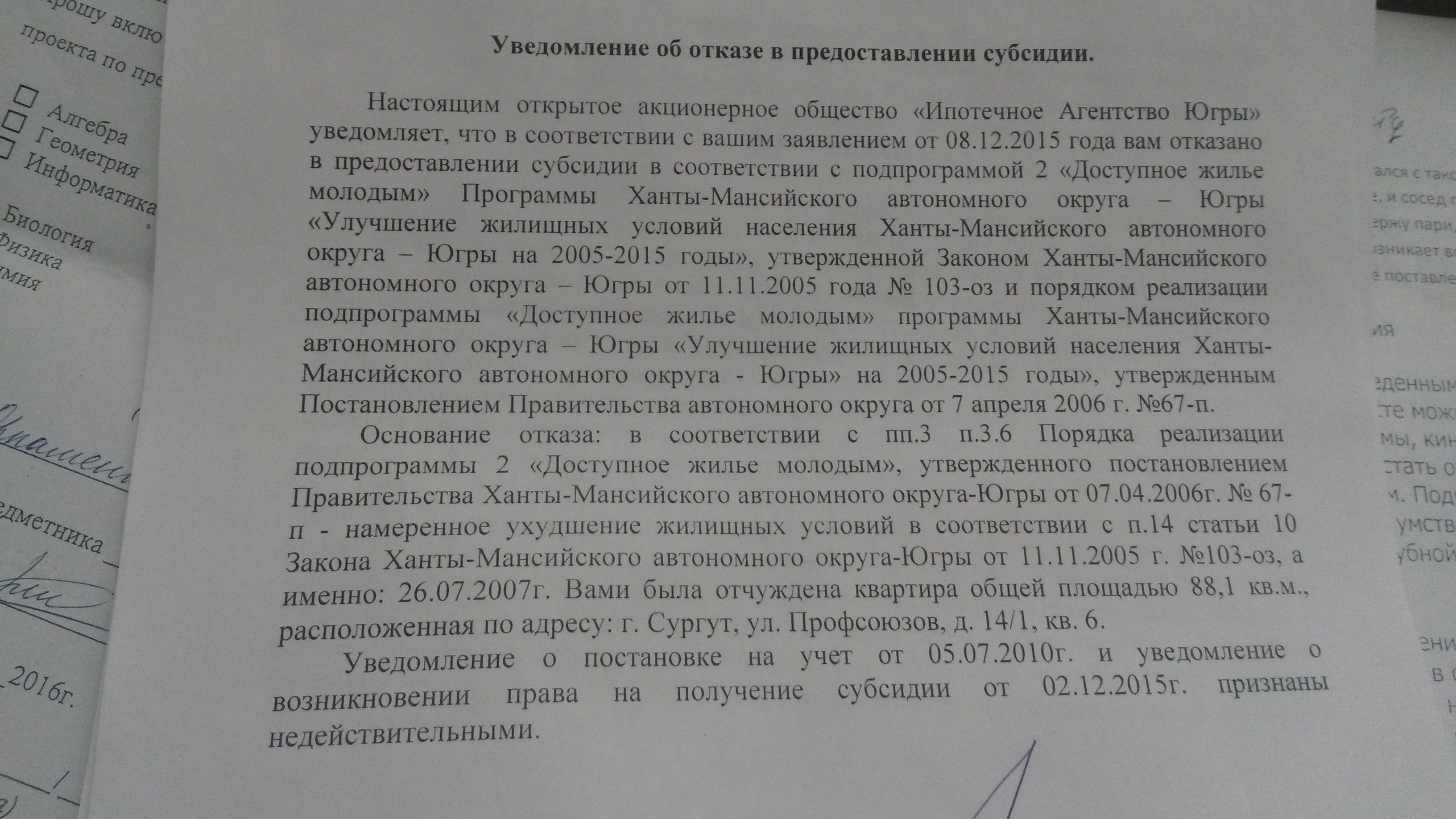 Я доки сдала ещё 7 декабря. Ждала 2 месяца, и тоже швыранули, сославшись на ухудшение жилищных условий. У дочери была 1/2 доли у мамы в трешке ( при приватизации несовершеннолетние идут автоматически). В октябре 2005 мама квартиру продала, 11.11.2005 вышел 103-оз. И нам все равно отказали, сославшись на п.14 ст.10 этого закона, где речь идёт про ухудшение жилищных условий в течение 5 предшествующих лет, НО не ранее вступления данного закона в силу. В программу вступили в июне 2010 ( 5 лет не прошло). Но и мамина квартира была продана до принятия закона. В ипотечке отправили доки на пересмотр, если опять откажут, пойду в суд. Тут и без юриста ясно, нарушают закон.