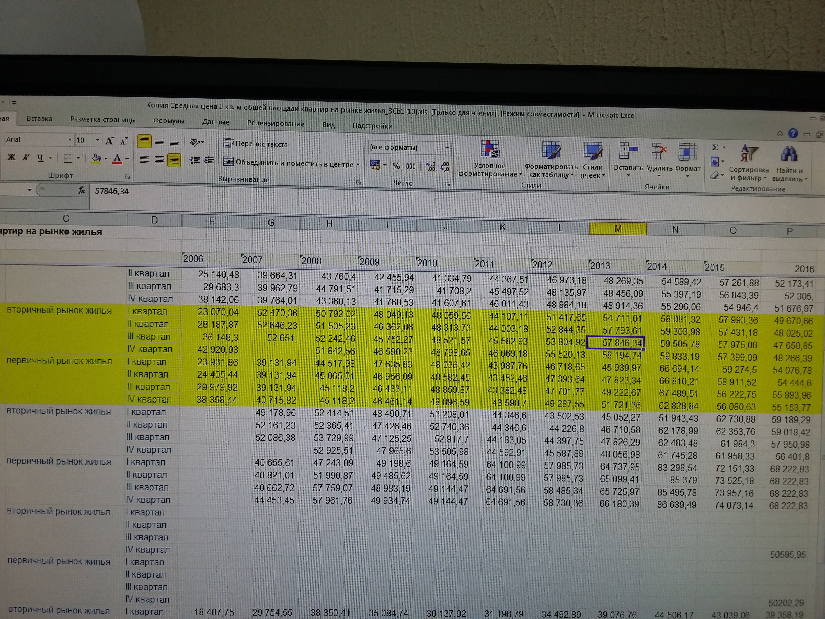masterkey писал(а): : 14.02.2017 12:09 komar писал(а): : 14.02.2017 10:17 Добрый день, подскажите пожалуйста, стоимость 1м2 трех комнатной квартиры (вторичка) в 3 квартале 2012 года. С телефона не могу открыть прикреплены файл. 53257,42 В декабре новые цены пришли и в актуальной таблице стоимость составляет 53804.92 А первый пост у меня нет прав редактировать...