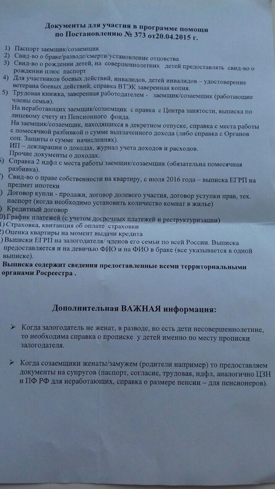 оказавшихся в сложной финансовой ситуации. Выкладываю сюда чек лист, по которому можно проверить себя - подхожу ли я и моя семья для получения помощи от Правительства. По справкам 2 НДФЛ и указанной формуле в чек-листе необходимо подсчитать - есть ли снижение дохода более чем на 30%; по договору купли-продажи и данным сайта госстатистики проверяем стоимость 1 кв м жилья (относится только к семьям, имеющим 1 и 2 ребенка, семьи, имеющие от 3-х детей - все ок). Если есть вопросы, задавайте, постараюсь ответить - дабы вы не выстаивали эти длинные очереди в банках для получения консультации. По всем вопросам, касаемо того, можете вы стать участником данной программы или нет, вас могут проконсультировать по тел. 88007555500 АИЖК Цитата: программу продлили, так что поздравляю всех, кто не успел сдать документы, у вас еще есть время ![]() если весь документ читать не хочется, данные о продлении на 16 стр. ))) внизу