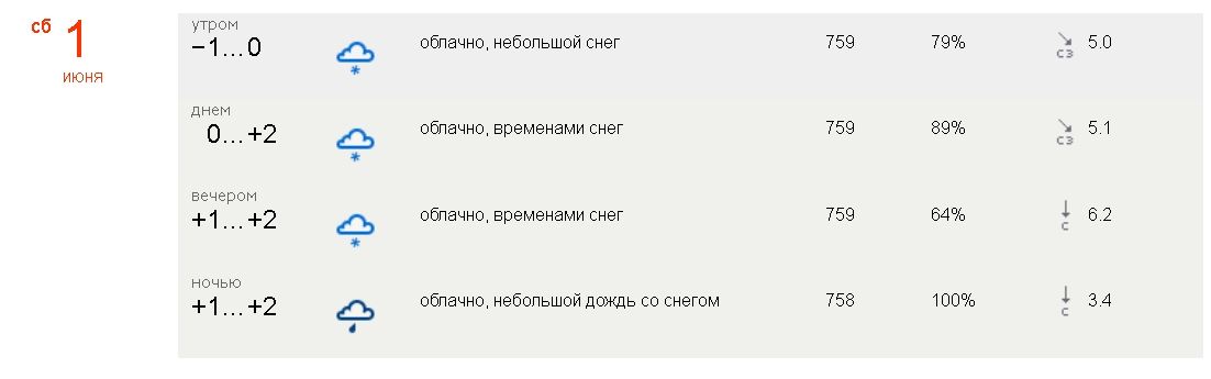 Цитата: Лето пришло! В Югре потеплеет, но ночью возможен снег По данным метеорологов, в Югре в ближайшие дни потеплеет. Правда, в отдельных районах ночью все-таки возможен мокрый снег с дождем и температура до 0 градусов. 6 июня в западной части ХМАО вообще ожидается +20 градусов. В восточной будет холоднее – до 10-12 градусов с большой вероятностью дождя. Снега, после 4 июня, пока не прогнозируется. Отметим, что в первый день лета на большей части Югры выпал снег. Явление породило много шуток в интернете, а также вызвало немало трудностей у автомобилистов. http://www.ugra-news.ru/frontpageart/29159