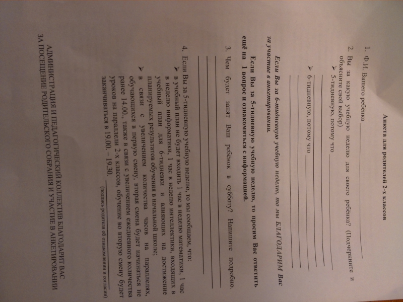 | -  0 : 8  + Вложение:Ну, ржу, не могу с этой анкеты   А точнее от курсива и ниже... Сидим над ней и обсуждаем варианты ответов для вопроса 3. "Чем будет занят Ваш ребенок в субботу? Напиште подробно.": -спать -есть -лузгать семечки -ходить в магазин за огуречным россолом для папы   ...... Только кому и какое дело, что мой ребенок будет делать в субботу  И какое это имеет отношение к анкетированию за 5 или 6 - дневку!!! Я, конечно, знала, что наша образовательная система в полной некрасоте, но это уже маразм какой-то  |