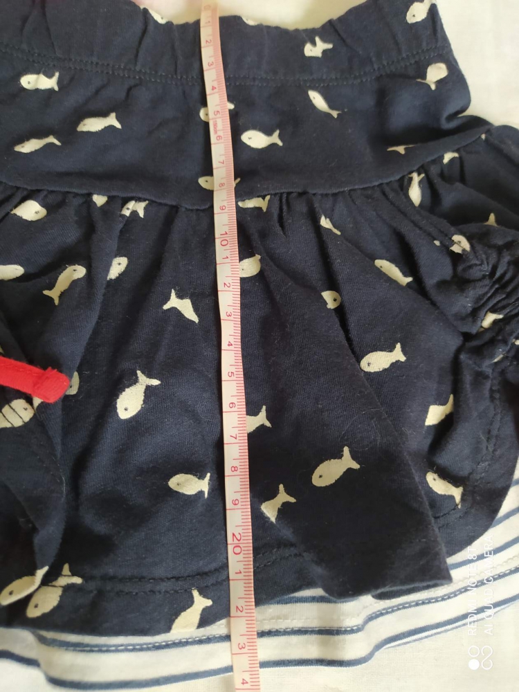 Талия на резинке украшена крупным бантом. Регулируемые брители скрещиваются сзади и доходят до талии. талия на резинке по бокам, и САРАФАНЧИК не на талии держится, на лямках. Размер 98см. Длина=53см. 500руб