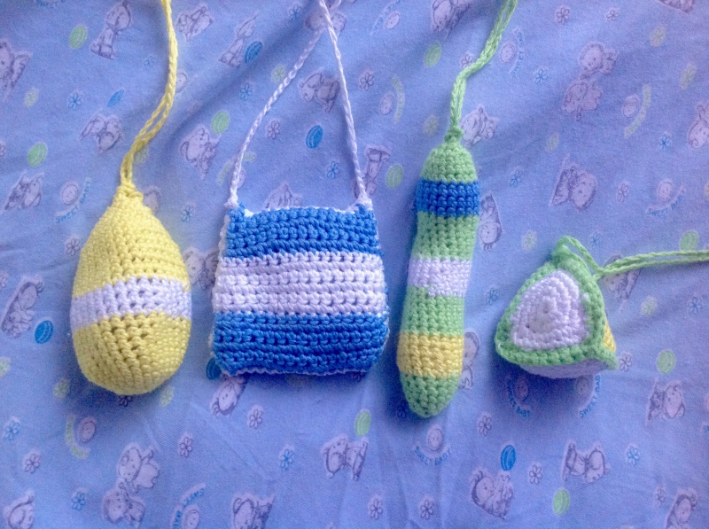 а крючки с пряжей удалось найти)) решила хоть свои фантазии на тему сенсорных мешочков воплотить в жизнь)) и вот что получилось))нитки все чистый хлопок , кроме зеленой- бамбук. Вязала не по схемам а как говорится "интуитивно" :) слева направо: мешочек с гречкой, сумочка с вишневыми косточками, колбаска с манкой и пирамидка с рисом :) сыну понравились :)))