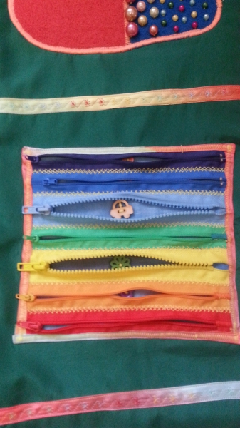 Радуга - шуршит, на липе. Солнышко вышито бисером с бубенчиками - звенит. Можно солнышко прятать за радугу - изучение и закрепление предлогов. Заяц: морковка на кнопке, объемная ягодка.