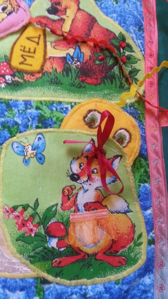 Лиса - карман на липучке: в итоге может и съесть колобка. Сама лиса "в юбочке" и с бантиком.