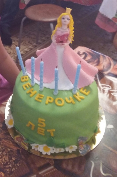 Я тоже заказала торт на день рождение доченьки у Гасановой С. Заказала карамельные коржи с творожно-сливоч.кремом плюс прослойка клубники. Честно мне не очень понравился крем. Чувствовался сильно вкус творога. Мы попросили сделать принцессу на торте. Принцесса получилась красивая, но держалась плохо, голова чуть не отвалилась. Приделала сама ее