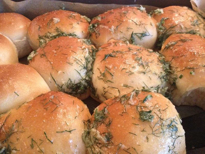 Борщ, к нему пампушки с чесночком, пирог с капустой. Есть фото только пампушек, остальное не успела