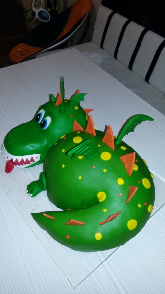 но гости кто как его обзывал, больше говорили что крокодил! бисквит пыталась на манер зебры испечь, тело и голову по раздельности мастикой обтягивала, а топом соединила, крылья и треугольники на спине крепила зубочистками, без них падали, а еще на фото видно что в районе хвоста и тела шов, не смогла единым листом, пришлось разрезать