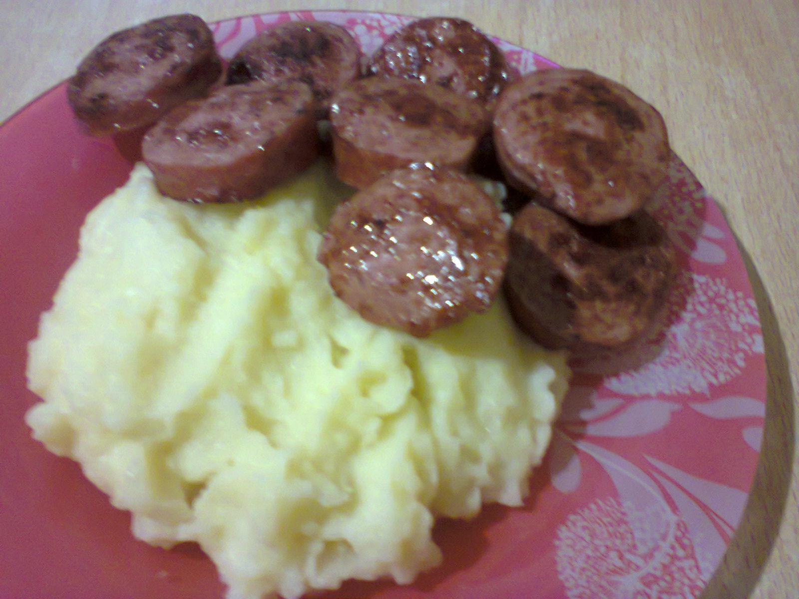 пюре с сардельками, салат Мимоза, яблочный пирог печется, чай с лимоном