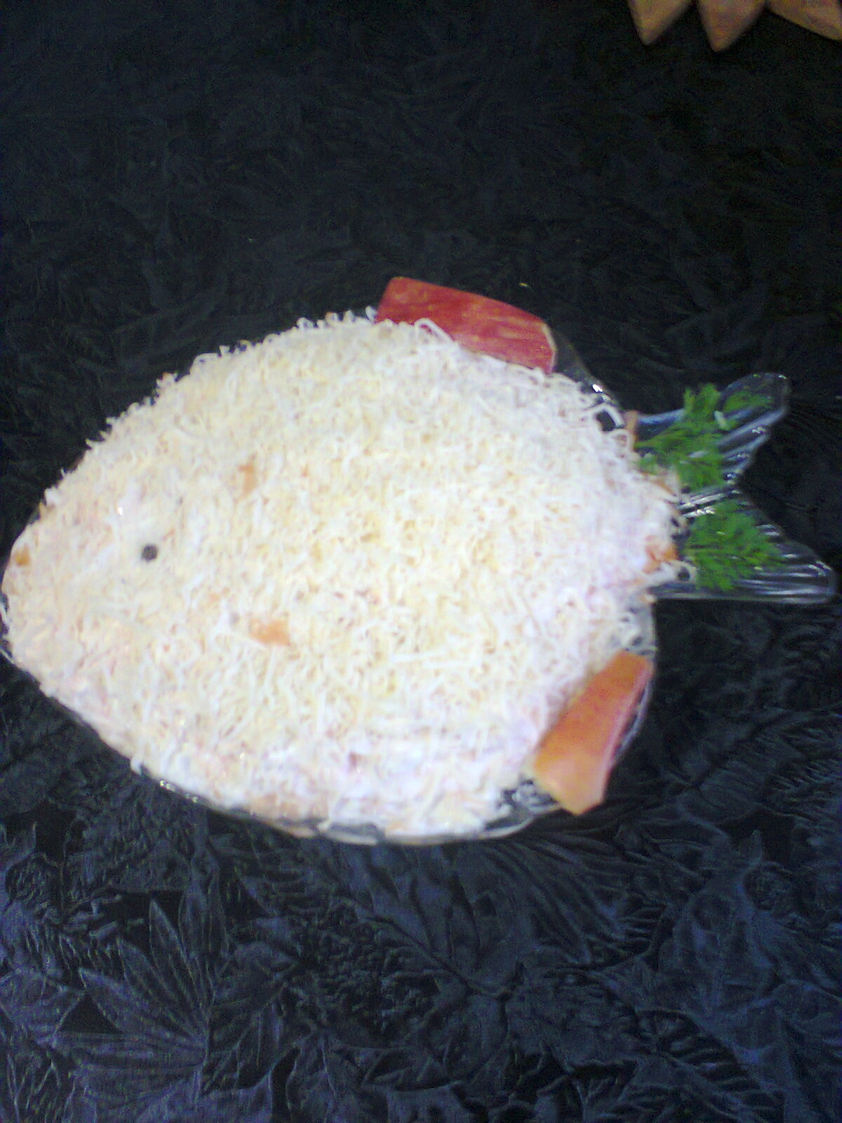 Морковь на терке свежая, сырок типа дружба плавленный, чеснок и майонез пополам со сметаной. У нас сегодня борщ с пампушками, копченная кета, картофель отварной с укропом.
