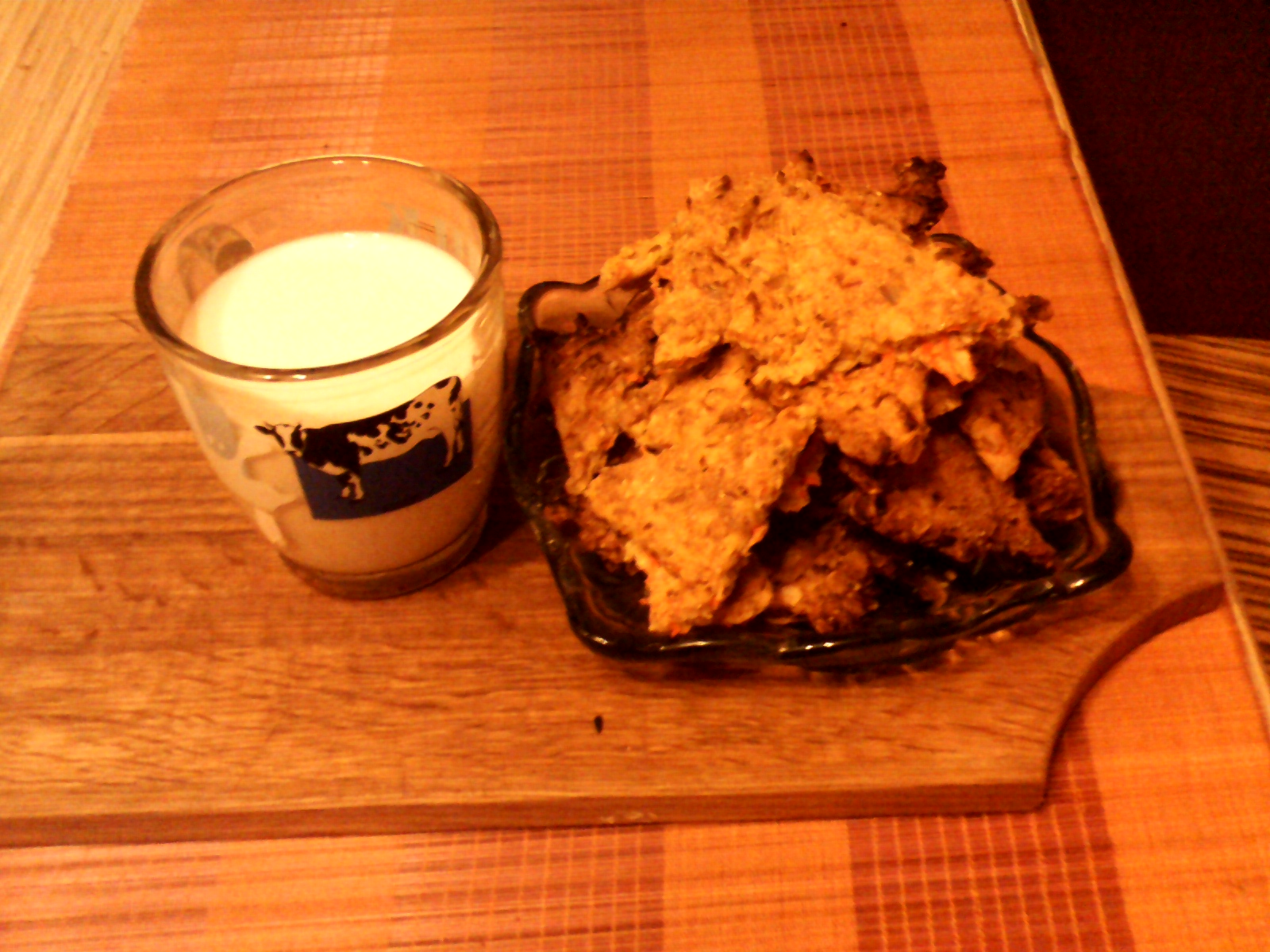 У меня печеньки с молоком на ужин. Печеньки из морковки, злаковых хлопьев, хотелось медом полить, но нельзя, посыпала сахаром тростниковым