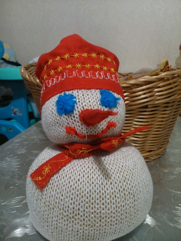 Посмотрела передачу Здорово Жить, там снеговичка делали из носочка белого. А я решила из старого свитера рукав отрезать. Один срез зашила, получился мешочек. Заполнила рисом, другой край зашила. По середине перетянула толстой ниткой, чтобы получилось два шарика, шея у снеговика образовалась :D А там дальше оформляйте как пожелаете. Шарфик из кусочка ткани прострочила вышивкой машинной, так же и на шапочке. Глазки и ротик шерстяными нитками прошила. Носик из ткани сшила. Получился как морковка этот носик. Внуку 2,7 года, этот снеговик ну очень понравился. *OK* *KISSED* Из второго рукавчика получился ещё один. На оба снеговика ушло 1 кг риса. Носик, ротик и глазки можно и пуговицами маленькими оформить, или маркерами цветными нарисовать.