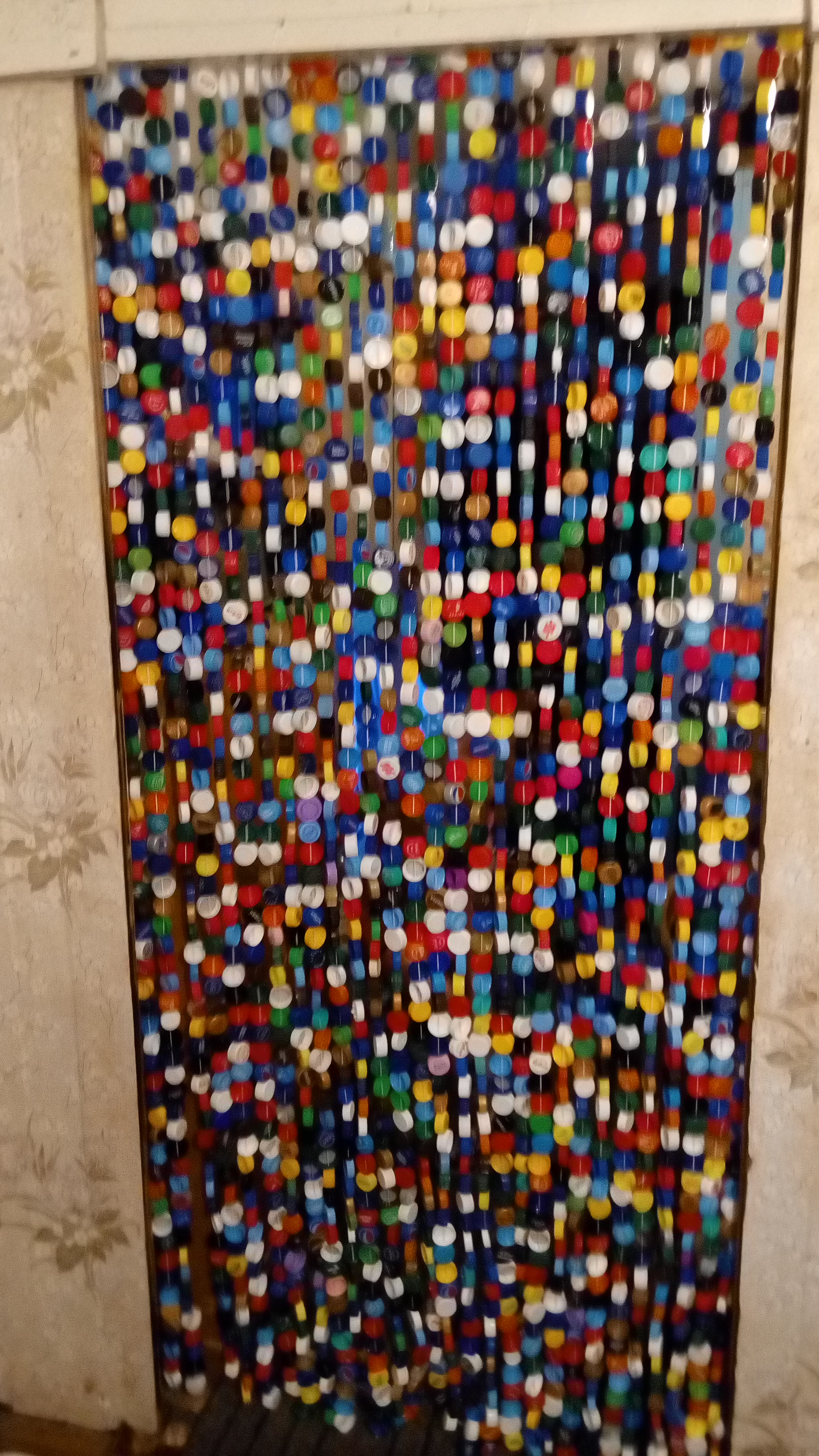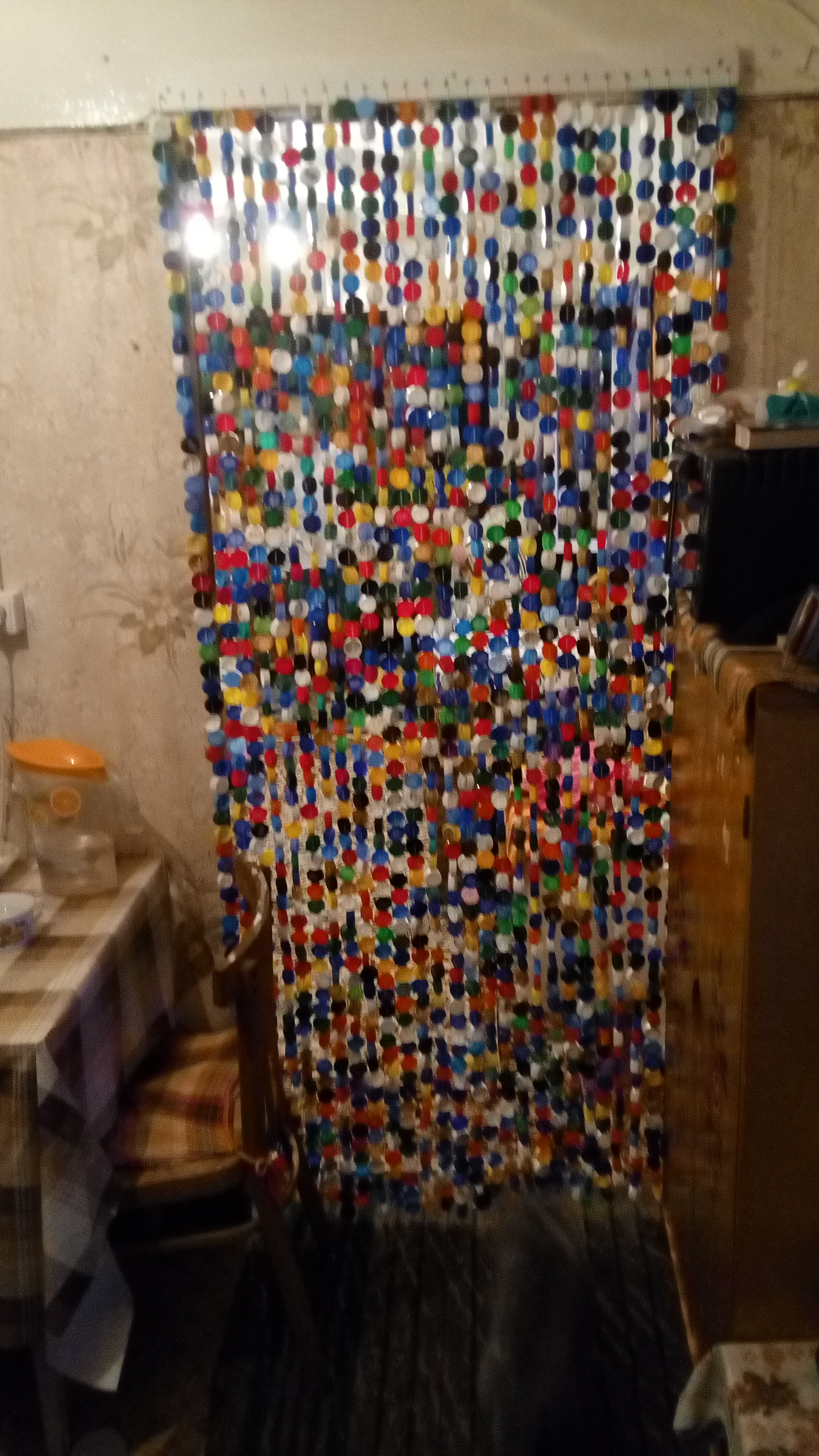 Шторка из крышечек от пластиковых бутылок на дачу