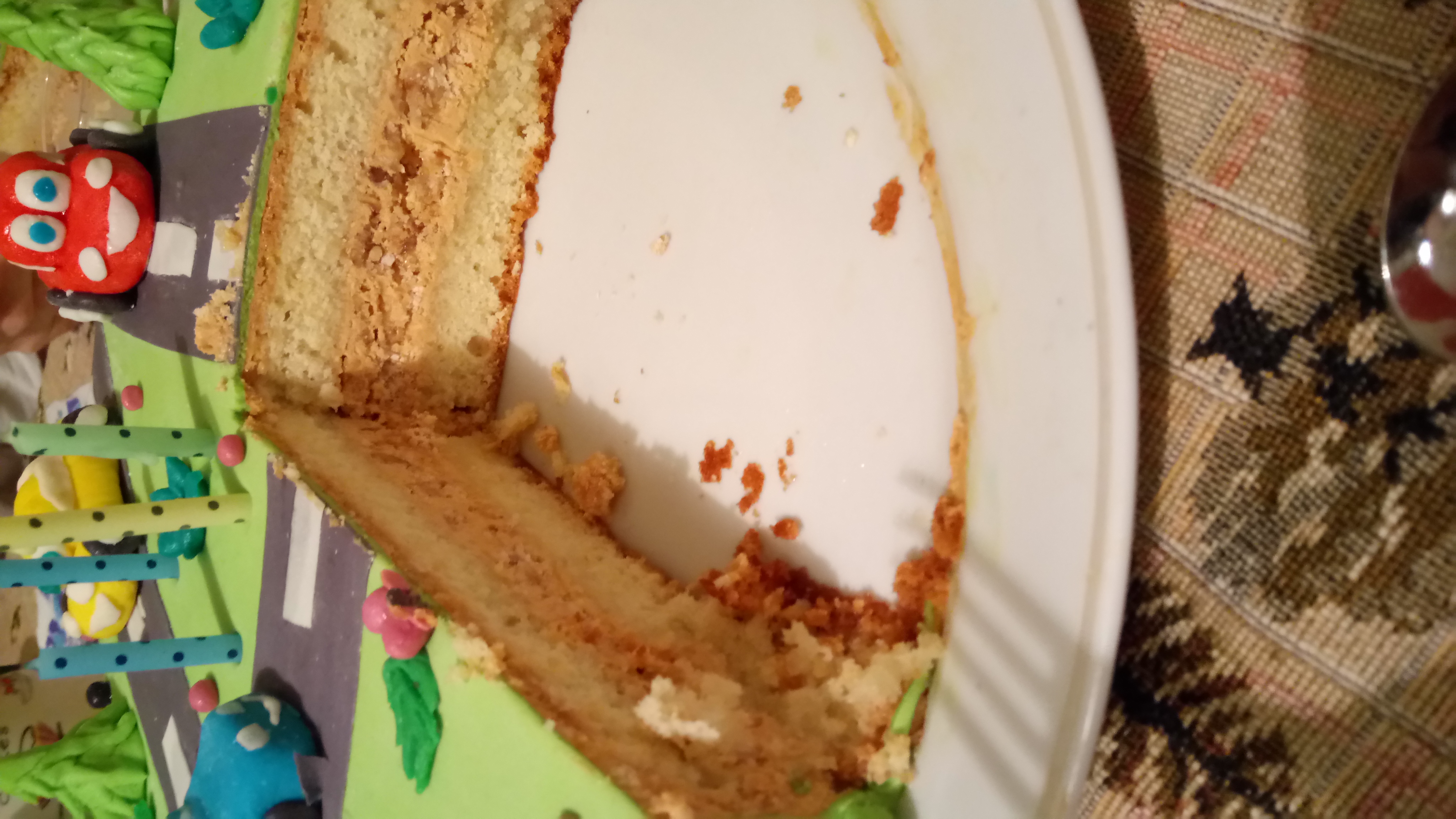Мой первый опыт работы с мастикой. Бисквит, в середине прослойка безе, масленый крем со сгущенным молоком. Машинки лепили дети.