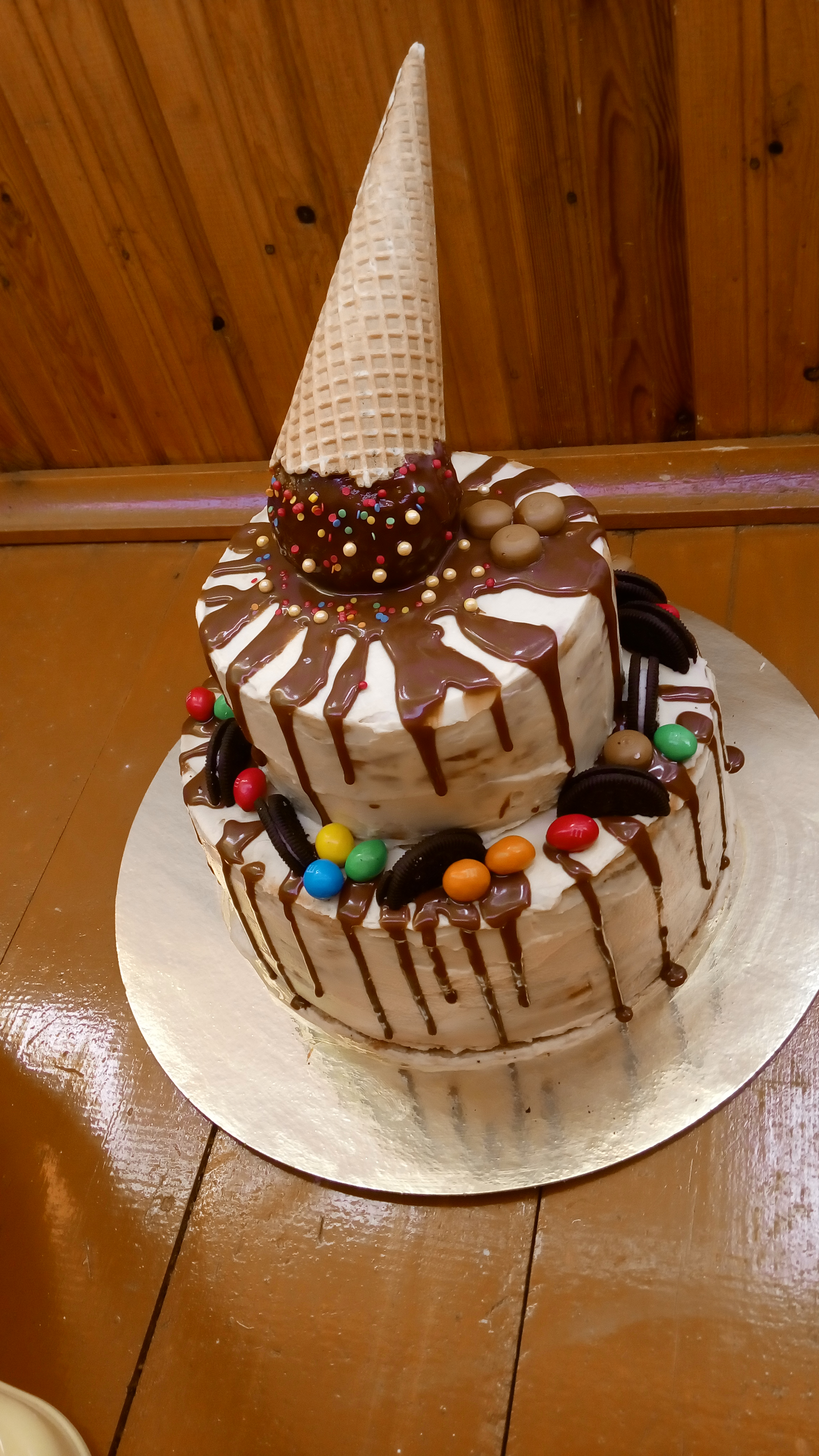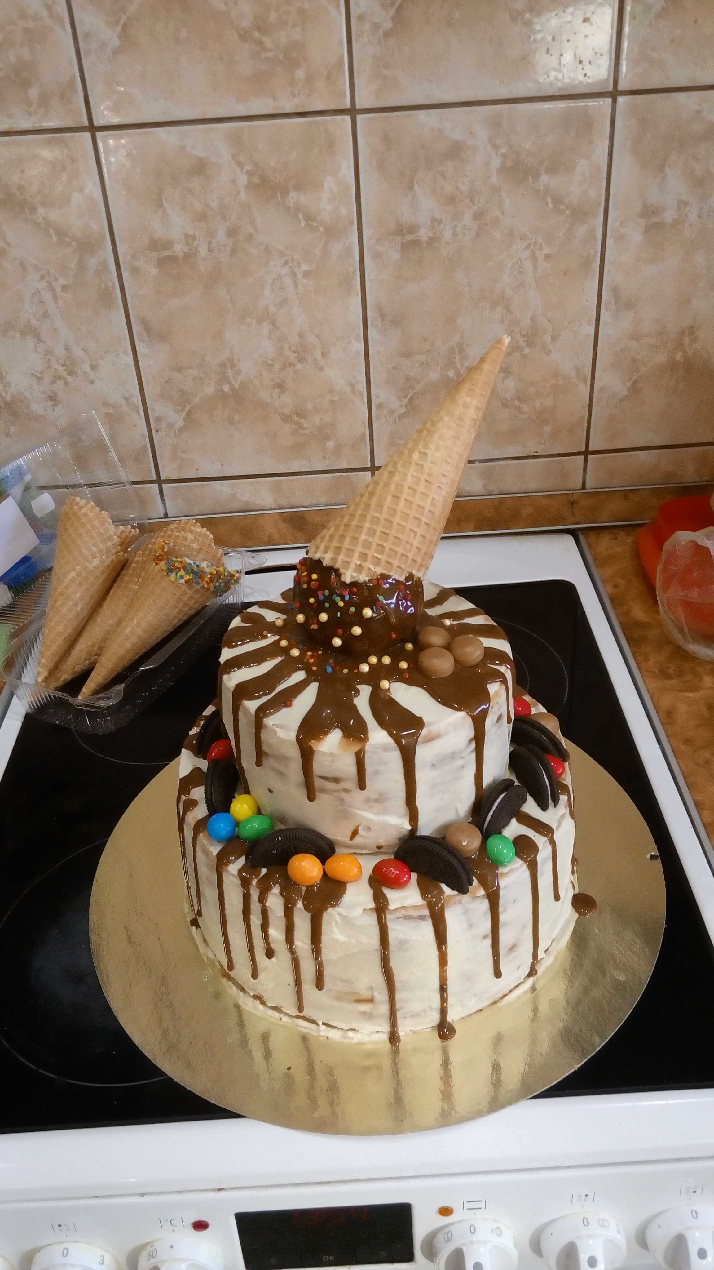olgarezh писал(а): : 21.11.2016 18:46 Nata86rus Как делали торт? Торт медовый,крем внутри классический,сгушенка,масло. Двухярусный,снаружи ровняла коржи ножом и выравнивала кремом чиз(творожный сыр сливочный,масло,сахарная пудра)Выравнивала раза 3,первый схватился,охладился и следующий.Украшала ганашем(шоколадные подтеки).Шарик для мороженого скатала из пироженого картошка,обмакнула в ганаш.Рожок готовый купила в красивом подходе.Украсила печеньками Орео и М/М |