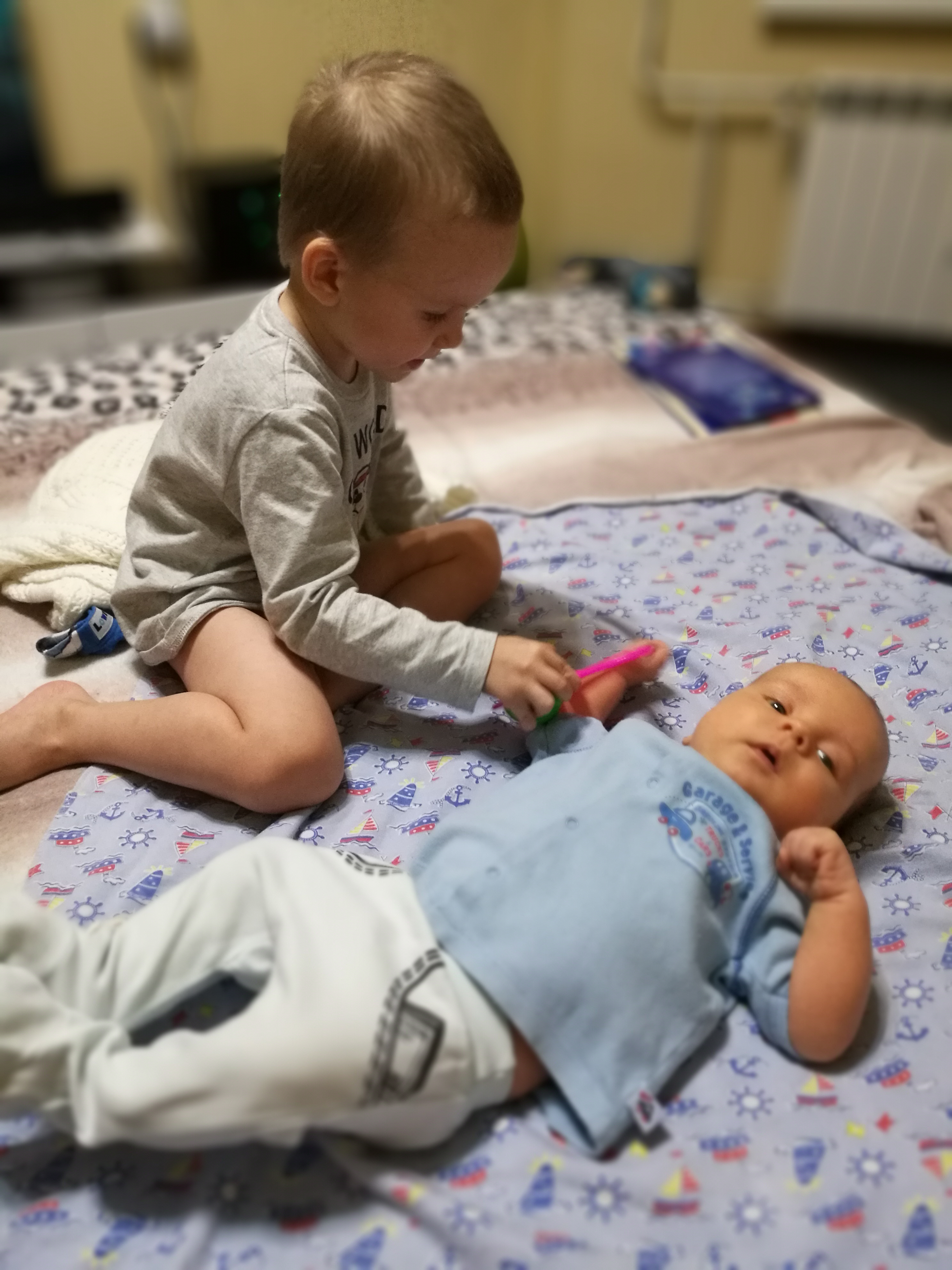 У нас тоже любофф , даже как то через чур, энергии много бегает хватает, целует, с погремушками играет, ему в руку запихивает. Все бы хлрошо, но и спать мелкому не даёт