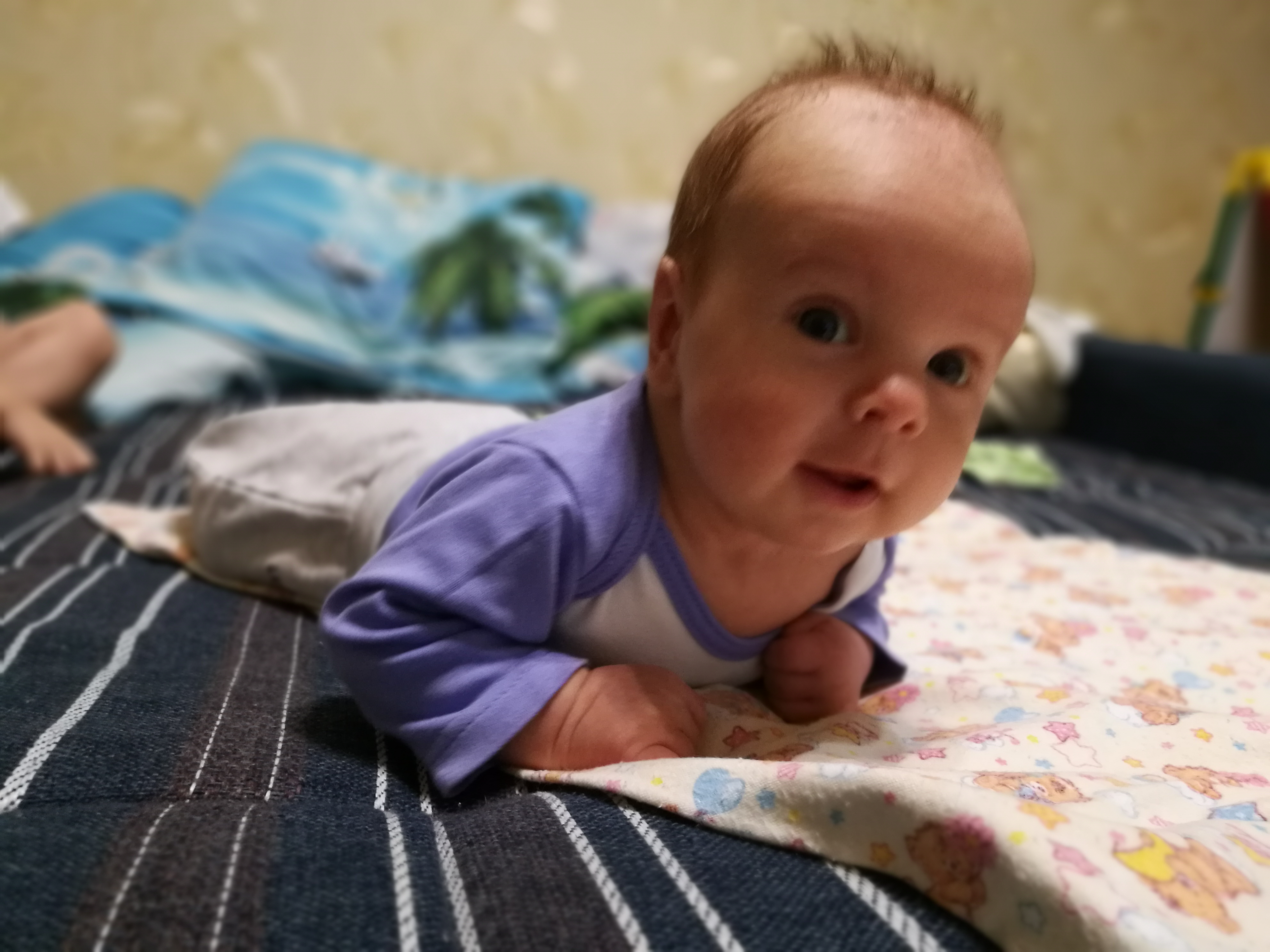 Нам до переворотов еще далеко, и на животе лежа только голову поднимает, на локти не встает еще, улыбается много и агукает *give_h*